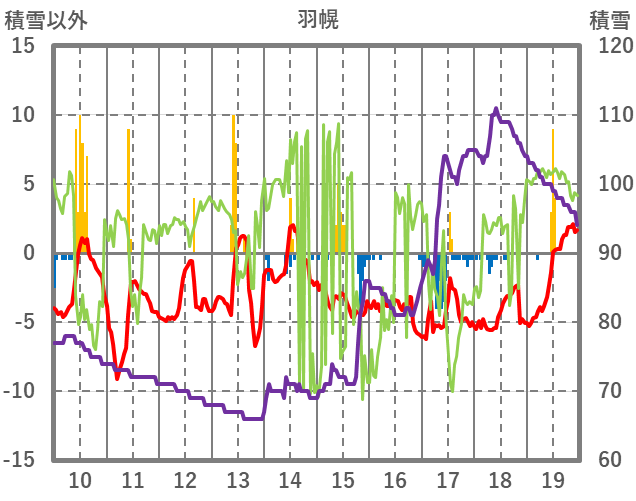 | 日 | 時 | 気温 | 降水 | 風向/風速 | 日照 | 積雪 | 降雪 |