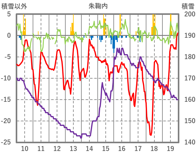 | 日 | 時 | 気温 | 降水 | 風向/風速 | 日照 | 積雪 | 降雪 |