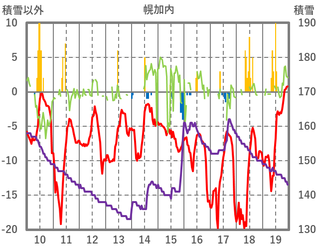 | 日 | 時 | 気温 | 降水 | 風向/風速 | 日照 | 積雪 | 降雪 |