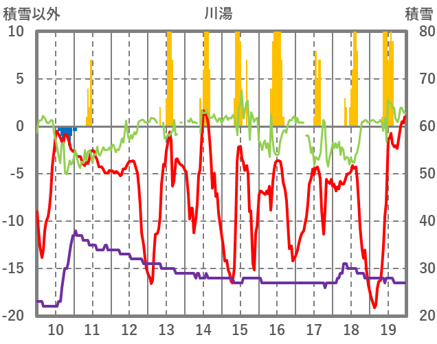| 日 | 時 | 気温 | 降水 | 風向/風速 | 日照 | 積雪 | 降雪 |