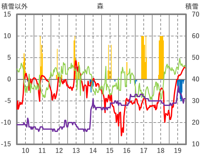 | 日 | 時 | 気温 | 降水 | 風向/風速 | 日照 | 積雪 | 降雪 |