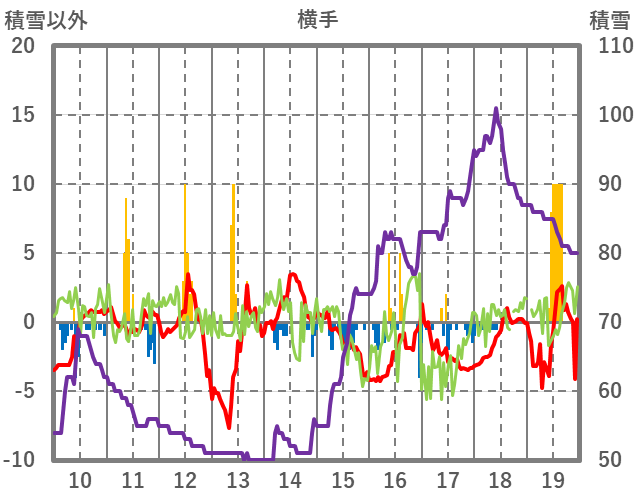 | 日 | 時 | 気温 | 降水 | 風向/風速 | 日照 | 積雪 | 降雪 |
