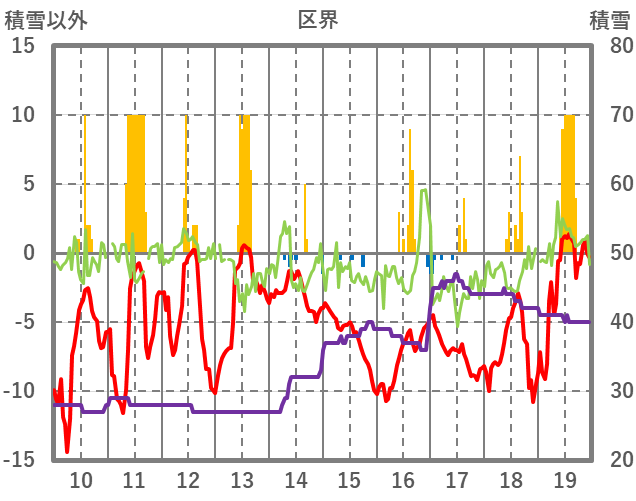 | 日 | 時 | 気温 | 降水 | 風向/風速 | 日照 | 積雪 | 降雪 |