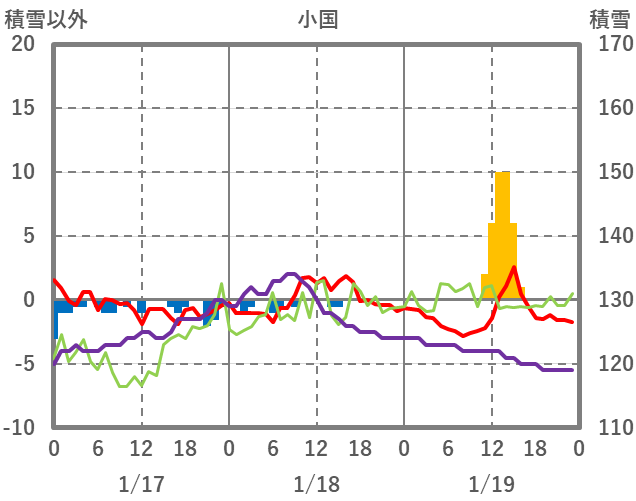 | 日 | 時 | 気温 | 降水 | 風向/風速 | 日照 | 積雪 | 降雪 |