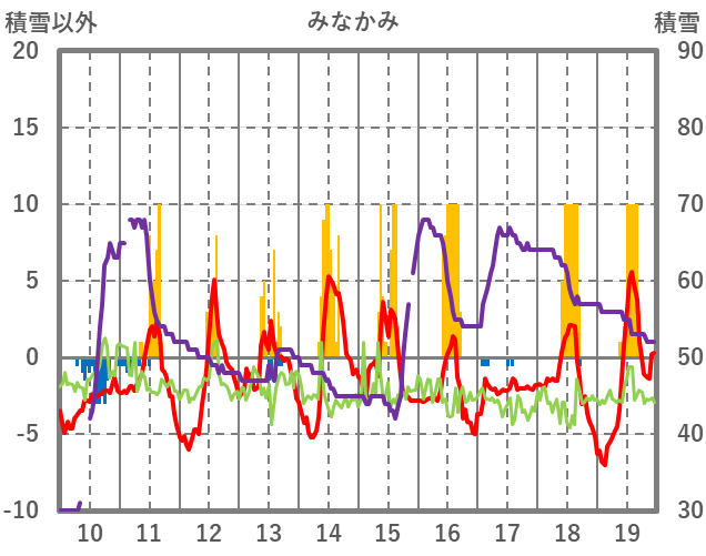 | 日 | 時 | 気温 | 降水 | 風向/風速 | 日照 | 積雪 | 降雪 |