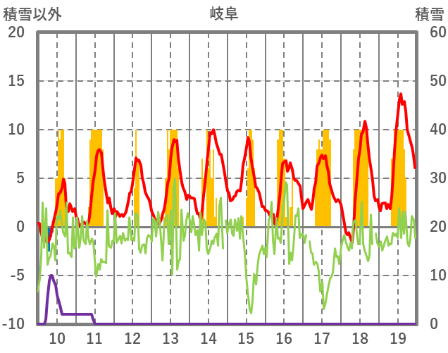 | 日 | 時 | 気温 | 降水 | 風向/風速 | 日照 | 積雪 | 降雪 |
