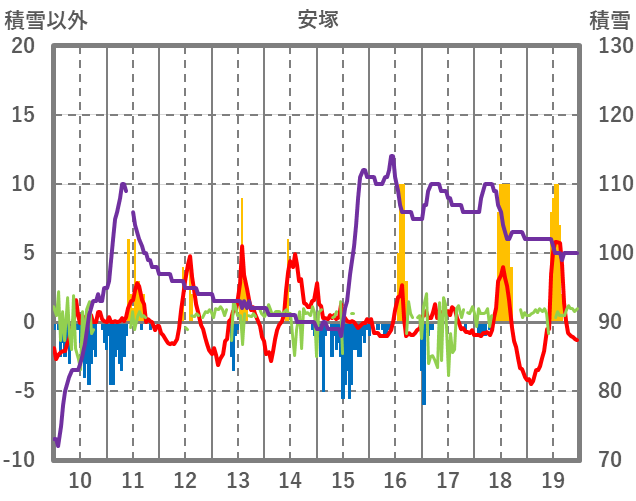 | 日 | 時 | 気温 | 降水 | 風向/風速 | 日照 | 積雪 | 降雪 |