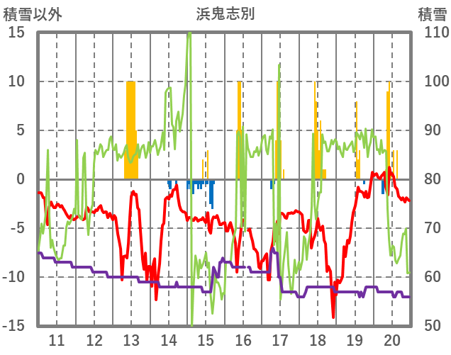 | 日 | 時 | 気温 | 降水 | 風向/風速 | 日照 | 積雪 | 降雪 |