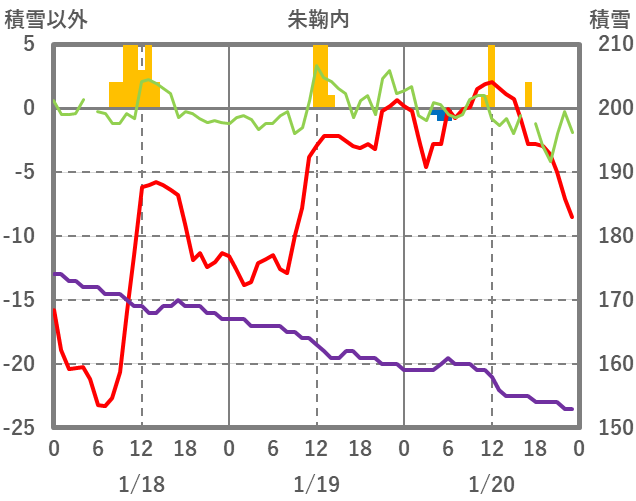 | 日 | 時 | 気温 | 降水 | 風向/風速 | 日照 | 積雪 | 降雪 |
