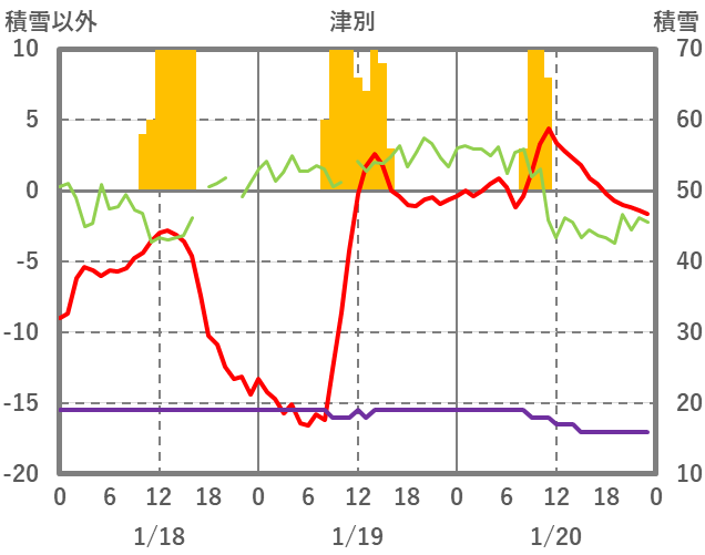 | 日 | 時 | 気温 | 降水 | 風向/風速 | 日照 | 積雪 | 降雪 |
