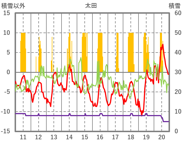 | 日 | 時 | 気温 | 降水 | 風向/風速 | 日照 | 積雪 | 降雪 |