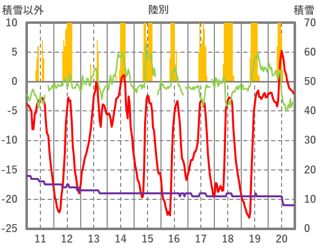 | 日 | 時 | 気温 | 降水 | 風向/風速 | 日照 | 積雪 | 降雪 |