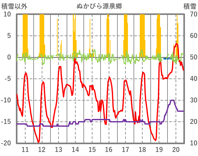 | 日 | 時 | 気温 | 降水 | 風向/風速 | 日照 | 積雪 | 降雪 |