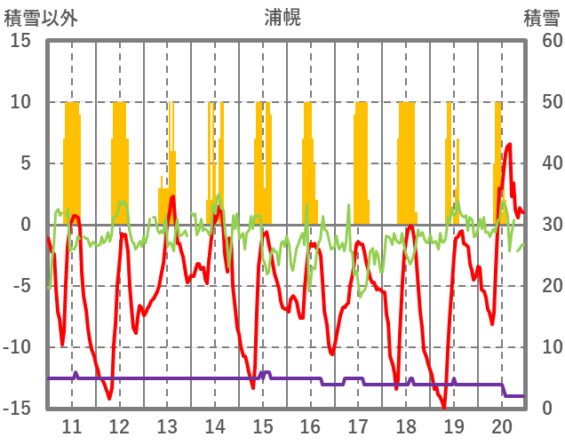 | 日 | 時 | 気温 | 降水 | 風向/風速 | 日照 | 積雪 | 降雪 |