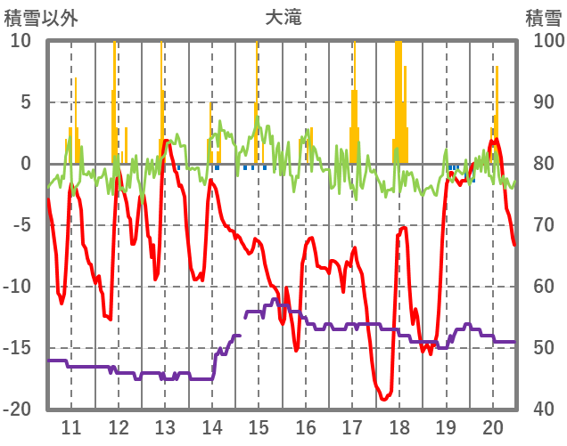 | 日 | 時 | 気温 | 降水 | 風向/風速 | 日照 | 積雪 | 降雪 |