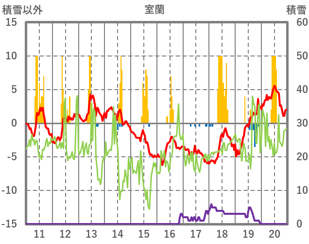 | 日 | 時 | 気温 | 降水 | 風向/風速 | 日照 | 積雪 | 降雪 |