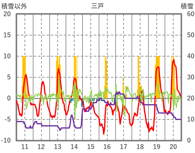 | 日 | 時 | 気温 | 降水 | 風向/風速 | 日照 | 積雪 | 降雪 |