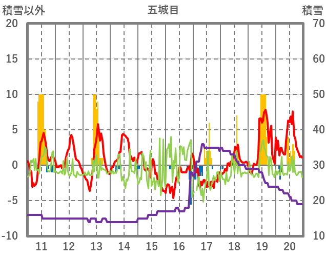 | 日 | 時 | 気温 | 降水 | 風向/風速 | 日照 | 積雪 | 降雪 |