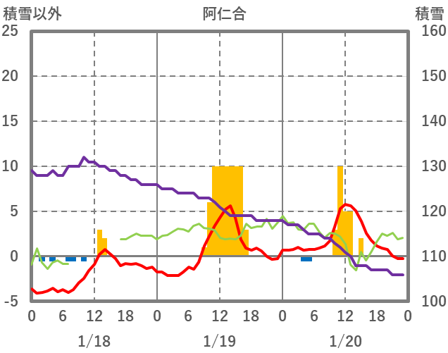 | 日 | 時 | 気温 | 降水 | 風向/風速 | 日照 | 積雪 | 降雪 |