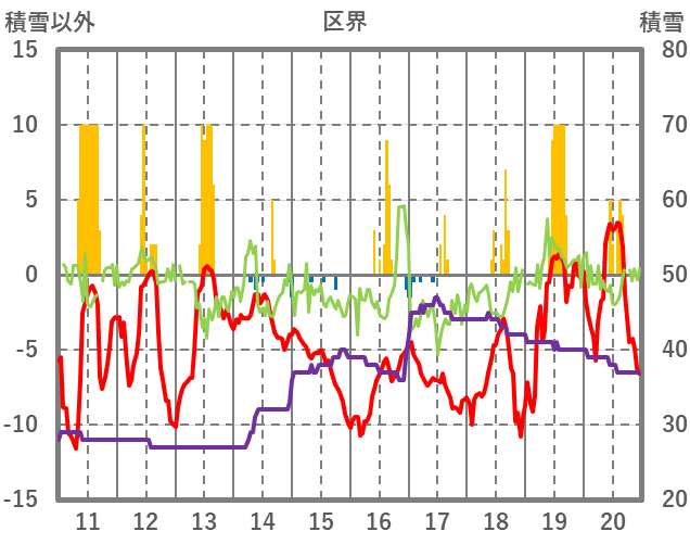 | 日 | 時 | 気温 | 降水 | 風向/風速 | 日照 | 積雪 | 降雪 |
