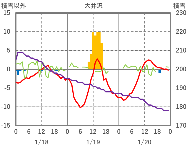 | 日 | 時 | 気温 | 降水 | 風向/風速 | 日照 | 積雪 | 降雪 |