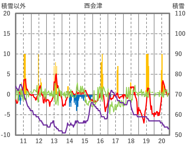 | 日 | 時 | 気温 | 降水 | 風向/風速 | 日照 | 積雪 | 降雪 |