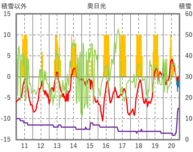 | 日 | 時 | 気温 | 降水 | 風向/風速 | 日照 | 積雪 | 降雪 |