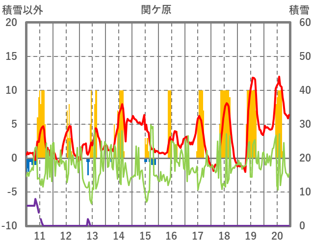 | 日 | 時 | 気温 | 降水 | 風向/風速 | 日照 | 積雪 | 降雪 |