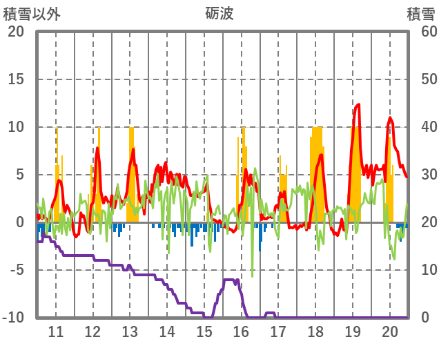 | 日 | 時 | 気温 | 降水 | 風向/風速 | 日照 | 積雪 | 降雪 |