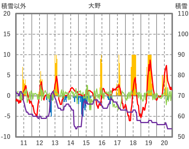 | 日 | 時 | 気温 | 降水 | 風向/風速 | 日照 | 積雪 | 降雪 |
