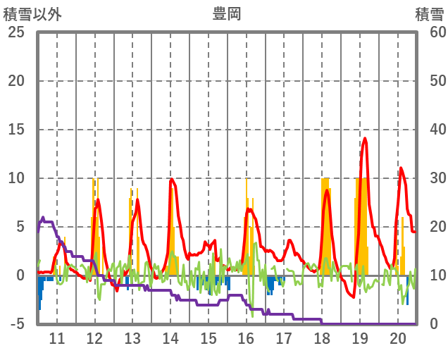 | 日 | 時 | 気温 | 降水 | 風向/風速 | 日照 | 積雪 | 降雪 |