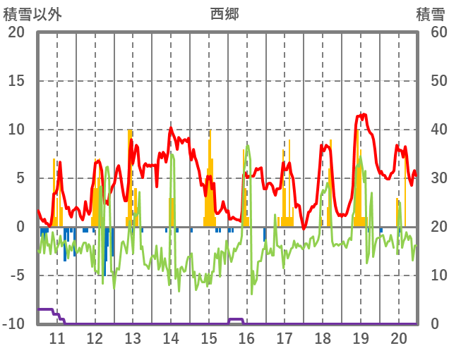 | 日 | 時 | 気温 | 降水 | 風向/風速 | 日照 | 積雪 | 降雪 |
