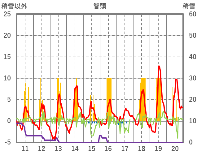 | 日 | 時 | 気温 | 降水 | 風向/風速 | 日照 | 積雪 | 降雪 |