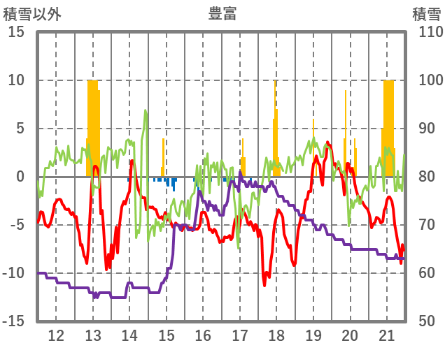 | 日 | 時 | 気温 | 降水 | 風向/風速 | 日照 | 積雪 | 降雪 |