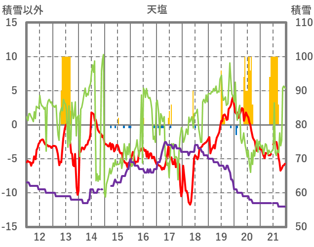 | 日 | 時 | 気温 | 降水 | 風向/風速 | 日照 | 積雪 | 降雪 |