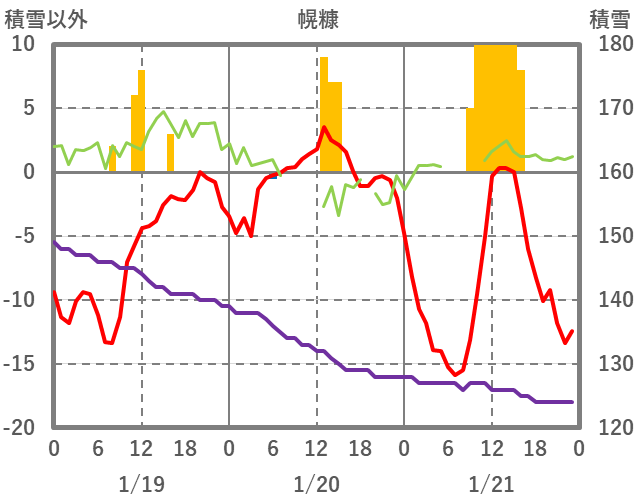 | 日 | 時 | 気温 | 降水 | 風向/風速 | 日照 | 積雪 | 降雪 |