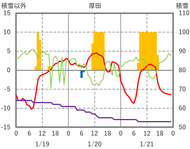 | 日 | 時 | 気温 | 降水 | 風向/風速 | 日照 | 積雪 | 降雪 |