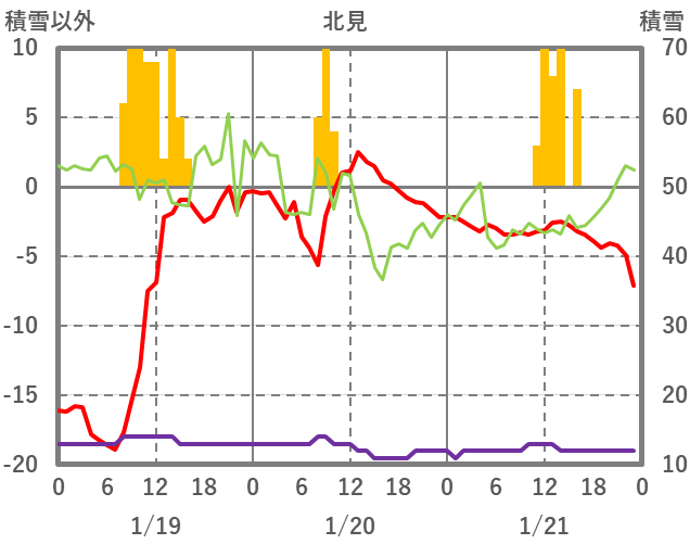 | 日 | 時 | 気温 | 降水 | 風向/風速 | 日照 | 積雪 | 降雪 |