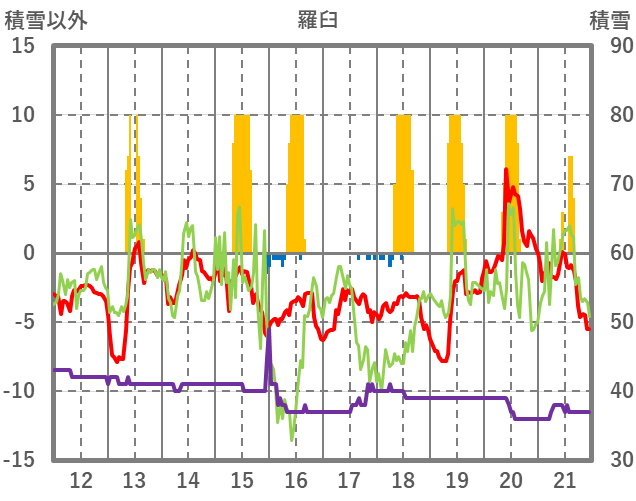 | 日 | 時 | 気温 | 降水 | 風向/風速 | 日照 | 積雪 | 降雪 |