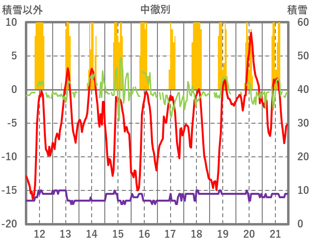 | 日 | 時 | 気温 | 降水 | 風向/風速 | 日照 | 積雪 | 降雪 |