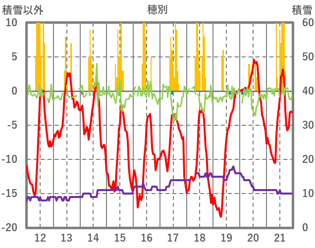 | 日 | 時 | 気温 | 降水 | 風向/風速 | 日照 | 積雪 | 降雪 |
