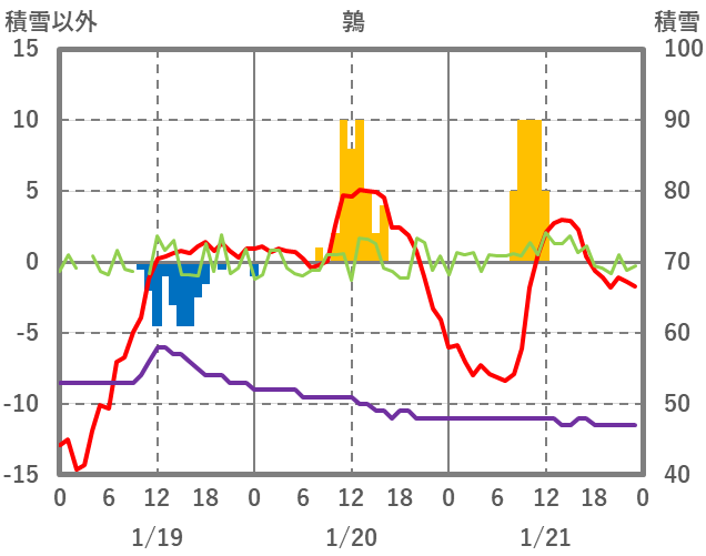 | 日 | 時 | 気温 | 降水 | 風向/風速 | 日照 | 積雪 | 降雪 |