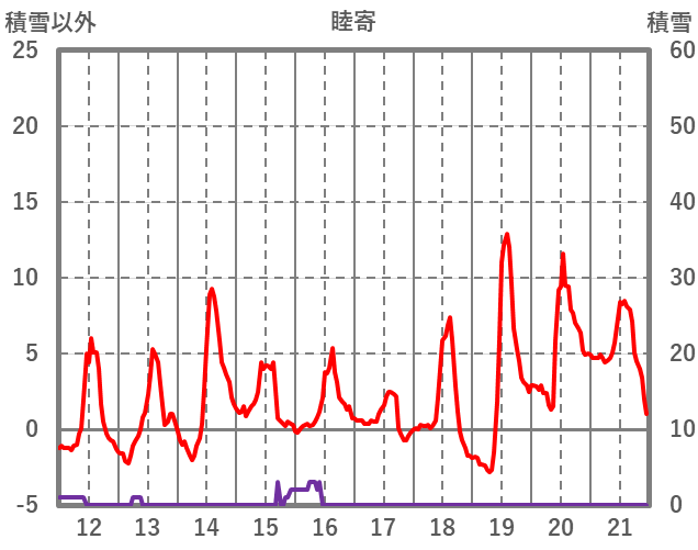 | 日 | 時 | 気温 | 降水 | 風向/風速 | 日照 | 積雪 | 降雪 |