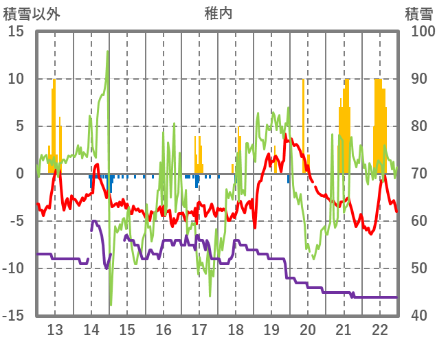 | 日 | 時 | 気温 | 降水 | 風向/風速 | 日照 | 積雪 | 降雪 |
