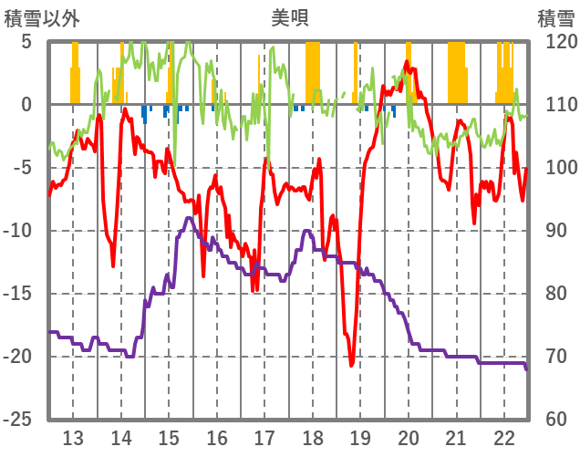 | 日 | 時 | 気温 | 降水 | 風向/風速 | 日照 | 積雪 | 降雪 |