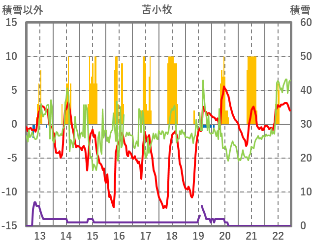 | 日 | 時 | 気温 | 降水 | 風向/風速 | 日照 | 積雪 | 降雪 |
