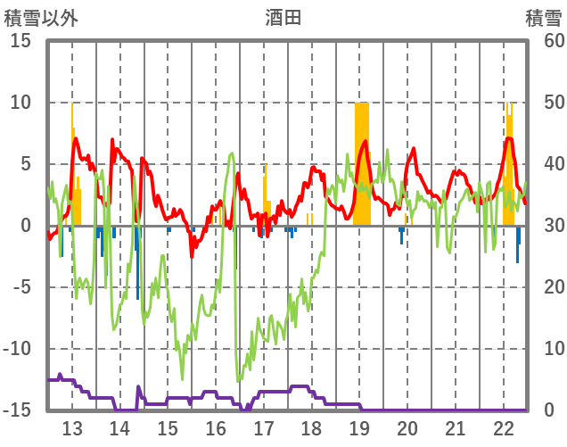 | 日 | 時 | 気温 | 降水 | 風向/風速 | 日照 | 積雪 | 降雪 |