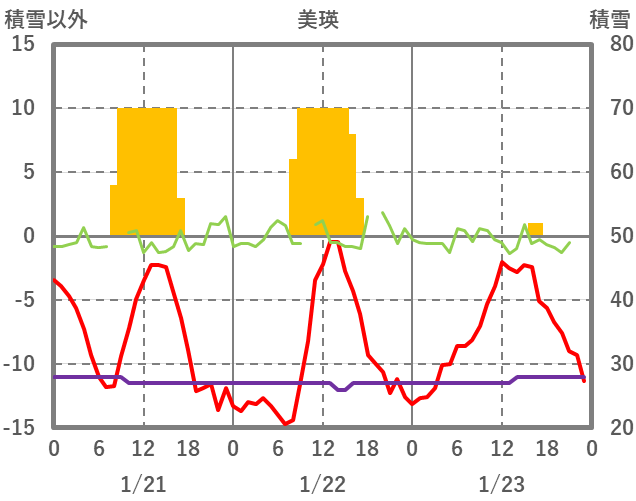 | 日 | 時 | 気温 | 降水 | 風向/風速 | 日照 | 積雪 | 降雪 |