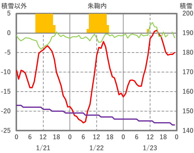 | 日 | 時 | 気温 | 降水 | 風向/風速 | 日照 | 積雪 | 降雪 |