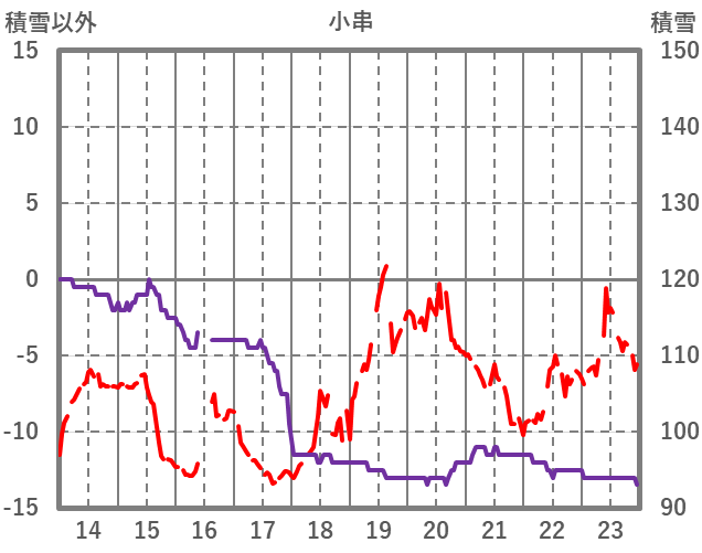 | 日 | 時 | 気温 | 降水 | 風向/風速 | 日照 | 積雪 | 降雪 |